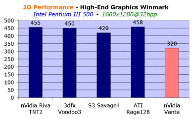 Нетрудно заметить, что скорость Leadtek WinFast 3D S320V в 2D просто не выдерживает никакой критики. Отставание почти в 2 раза от Riva TNT2. Конечно же, наш глаз не в состоянии увидеть все эти различия (почти все современные видеокарты в 2D нам кажутся очень быстрыми), поэтому будем акцентировать наше внимание на качестве 2D. Ну что же, с качеством в 2D у Vanta примерно также, как и со скоростью. Качество в 2D графике на высоком уровне только в режимах до 1024х768, в 1280х1024 его можно назвать терпимым, но по сравнению с Riva TNT оно хуже (несмотря на то, что оба чипа имеют RAMDAC с частотой 250 МГц) и намного хуже, чем у Riva TNT2. В режиме 1600х1200 работать на Leadtek WinFast 3D S320V практически невозможно (это чисто субъективное мнение, конечно, но мои глаза уставали очень быстро). Режим 1920х1200 монитор потянул, но разглядеть что-либо было уже проблематично. Сразу ясно, что этот режим ввели только исходя из маркетинговых соображений.
