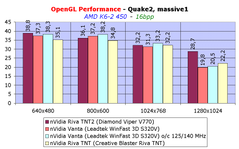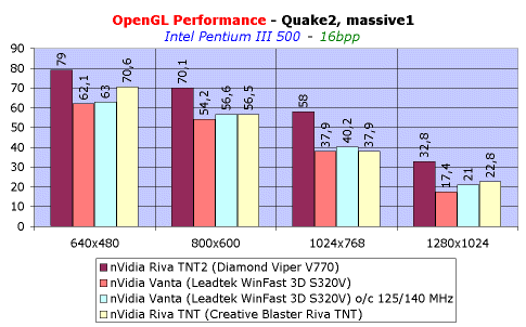 По умолчанию, чипсет Vanta работает на частоте 100 МГц, а память на 125 МГц. Разгон при помощи Tweak-утилиты от Leadtek позволяет разогнать чипсет до 125, а память до 140 МГц. Поэтому мы исследовали работу Leadtek WinFast 3D S320V в двух вариантах: по умолчанию (100/125 МГц) и в режиме разгона (125/140 МГц). Сразу скажу, что попытки установить более высокие значения частот успехом не увенчались, Leadtek WinFast 3D S320V работала либо нестабильно, либо зависала.