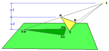 y1+y2 — это расстояние от источника света до плоскости. y2 — расстояние от точки А до плоскости. Так как плоскость горизонтальна и проходит через начало координат, то значения y1 и y2 легко определить. y2 — это Y координата вершины А и (y1+y2) — это Y координата точки L.