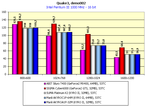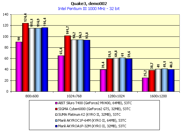 Приступаем к оценке производительности видеокарты в 3D. Должен отметить, что мы уже многократно рассматривали этот вопрос подробно, к тому же в наших 3DGiТогах есть подробные сравнительные тесты, откуда можно узнать относительное положение KYRO II-карт среди всех прочих. Поэтому в данном разделе я ограничусь тестами на базе id Software Quake3 v.1.17 — игрового теста, демонстрирующего работу плат в OpenGL с использованием стандартного демо-бенчмарка demo002.