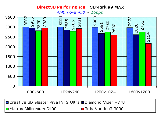 На низких разрешениях 3dfx Voodoo3 3000 немного обогнала Matrox Millennium G400, но, в целом, позиции нашей карты практически не пошатнулись. Здесь надо еще учитывать, что Matrox Millennium G400 работает на частоте 125 МГц по чипсету и 166 МГц по памяти, в отличие от 3dfx Voodoo3 3000 — 166/166 МГц.