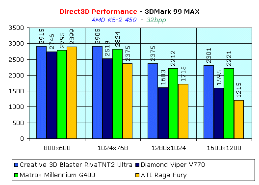 Пойдем дальше. На очереди рассмотрение скоростных показателей Matrox Millennium G400 в 3D. Учитывая время выхода этой платы (вслед за nVidia Riva TNT2 и 3dfx Voodoo3), а также заявленные характеристики, позволяющие говорить о высокой конкурентоспособности Matrox Millennium G400, мы решили сравнивать Matrox Millennium G400 с видеокартами на чипсетах nVidia Riva TNT2 (Diamond Viper V770 16 Мбайт) и 3dfx Voodoo3 3000. По цене Matrox Millennium G400 будет находиться как раз между этими двумя картами. При анализе работы платы в 32-битном цвете мы также использовали данные ATI Rage Magnum на чипе ATI Rage128, по ценовой категории тоже конкурирующей с G400. Также мы решили привести данные и одной из наиболее быстрых плат на сегодня — Creative 3D Blaster Riva TNT2 Ultra. Дальше вы убедитесь, что не зря.
