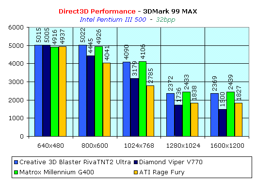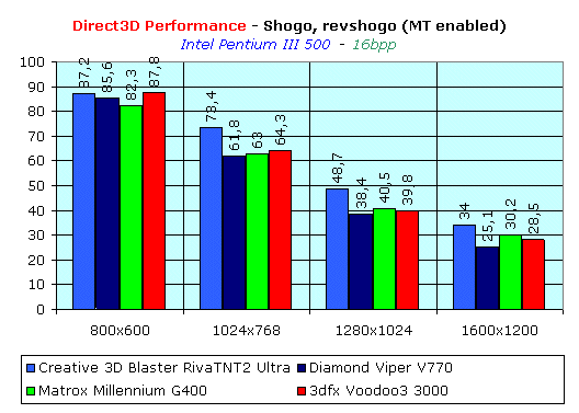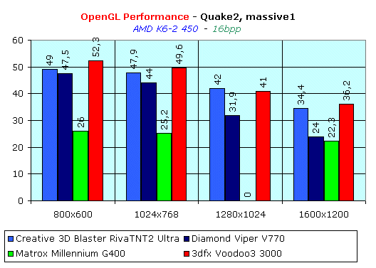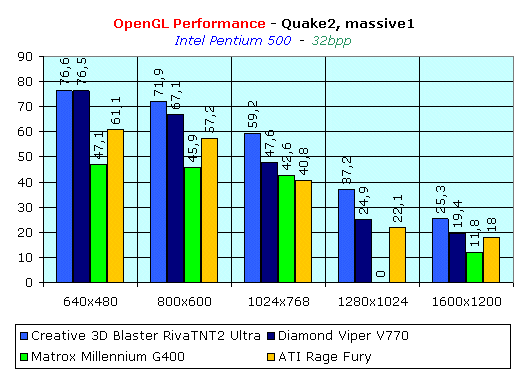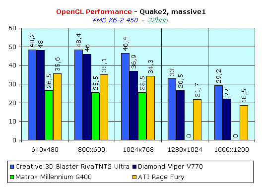 А тут уже нет такого однообразия. Мы можем видеть, что в Direct3D Matrox Millennium G400 начинает выходить вперед только на высоких разрешениях (1280х1024 и выше). О конкурировании с Creative 3D Blaster Riva TNT2 Ultra речь даже не идет. Ну на по поводу OpenGL — история та же, повсюду отставание, и серьезное. Показатели даже ниже, чем требуется для нормальной играбельности.