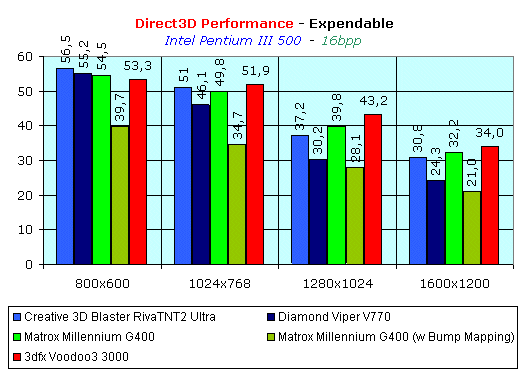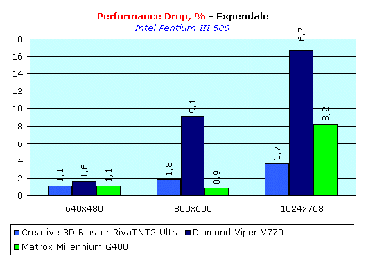 А теперь мы постараемся ответить на вопрос, который мы подняли в начале рассмотрения работы Matrox Millennium G400 в 32-битном цвете: какую цену (имеется в виду падение производительности) надо заплатить, чтобы смело работать в True Color? Посмотрим на диаграммы падения скорости на основе игры Expendable.