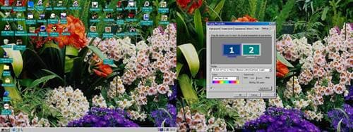 Второй вариант, наиболее интересный — это возможность подключения второго монитора. При этом мы можем как использовать второй монитора в качестве дублера первого (то есть на втором полностью повторяется изображение с первого), так и для расширения рабочего стола. Эту возможность мы рассмотрим поподробнее. В данном случае мы можем выбрать один из двух мониторов и конкретно для него осуществить настройки по разрешению, частоте регенерации и др. Все это возможно благодаря тому, что Matrox Millennium G400 имеет два раздельных модуля CRTC (Cathode Ray Tube Controller), которые позволяют использование двух мониторов независимо друг от друга. Таким образом, к Matrox Millennium G400 можно подключать совершенно разные по своим характеристикам мониторы (кроме LCD, для них требуется отдельный модуль). После настройки обоих мониторов (я сделал на обоих одинаковое разрешение 1024х768) мы можем видеть необычного размера рабочий стол: