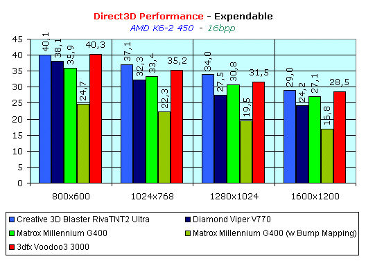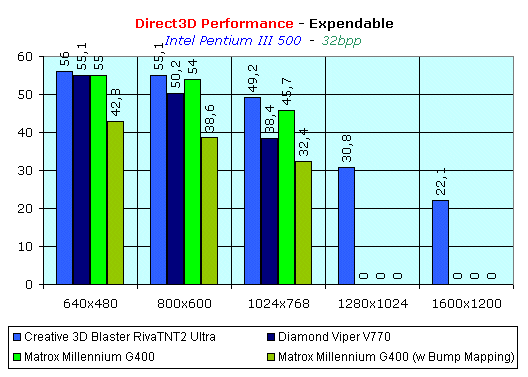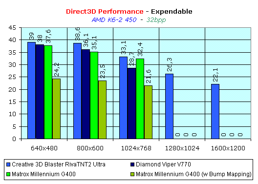 Тем не менее, даже в такой игре, как Expendable, которая поддерживает мультитекстурирование, мы не видим, как раньше, победы 3dfx Voodoo3 3000, а примерное равенство с Matrox Millennium G400. Правда, за использование такого красивейшего эффекта, как рельефное текстурирование, приходится заплатить скоростью. Тем не менее, падение скорости при работе с Environment mapped Bump mapping не является настолько критичным, чтобы отказываться от использования этой особенности Matrox Millennium G400.