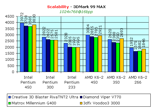 И в заключение рассмотрения скоростных показателей Matrox Millennium G400 мы приведем диаграмму зависимости скорости работы платы от частоты центрального процессора:
