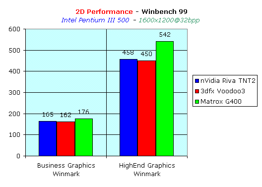 Теперь о самом тестировании. Начинаем с 2D-графики, которая является для Matrox своеобразным коньком. В настоящее время на рынке есть много видеокарт с неплохим 3D и неважным 2D, что отталкивает владельцев больших мониторов. Поэтому мечтой многих является появление видеокарты, соединяющей в себе как быструю и качественную 2D-, так и мощную 3D-графику. Что же нам может дать Matrox Millennium G400 в области 2D? Мы исследовали этот вопрос, пользуясь Winbench 99, протестировав работу 2D в разрешении 1600х1200 при 32-битном цвете на Pentium III-500 — системе: