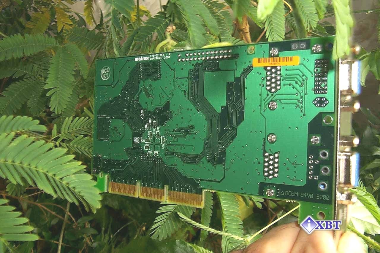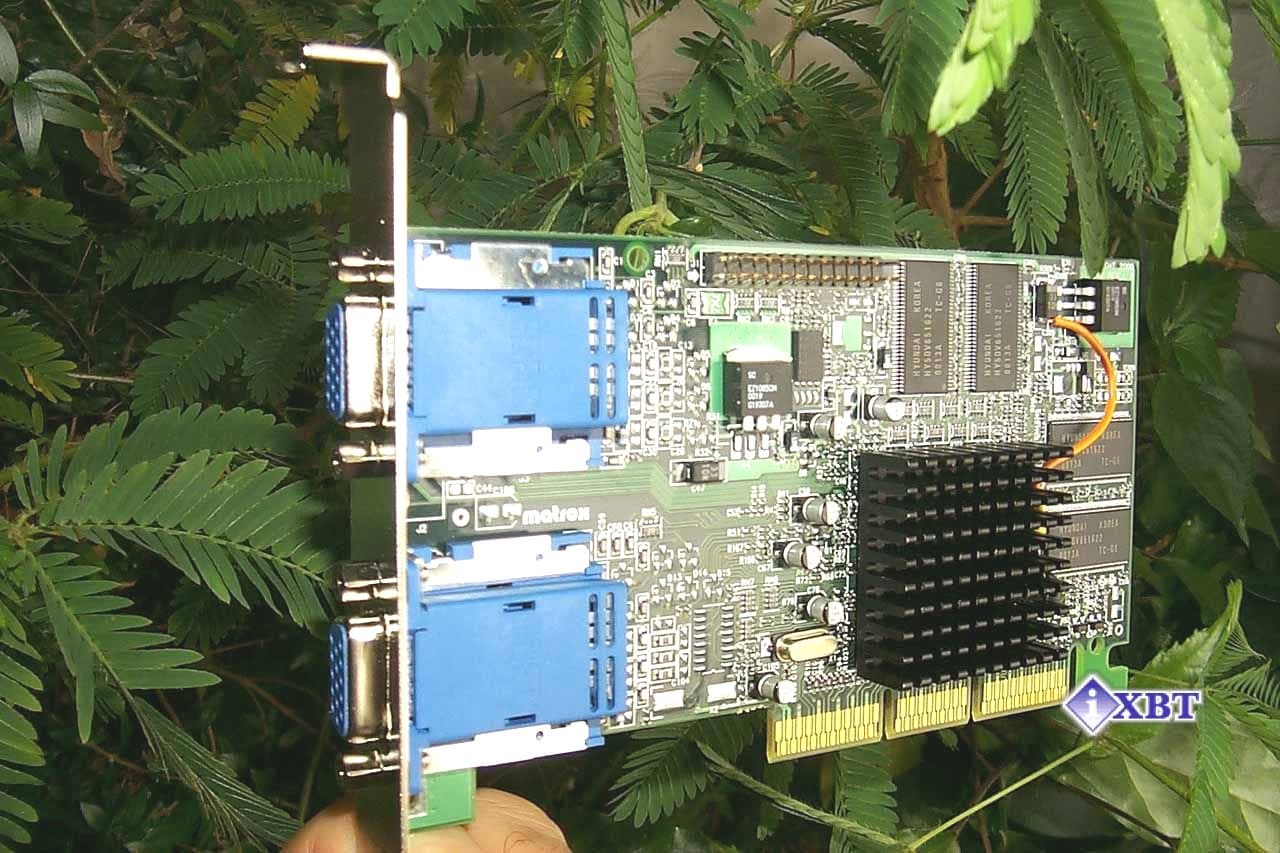 Плата имеет традиционный для Matrox темно-зеленый цвет. На PCB установлены гнезда для подключения двух VGA-мониторов. В комплект входит переходник для вывода изображения на телевизор.
