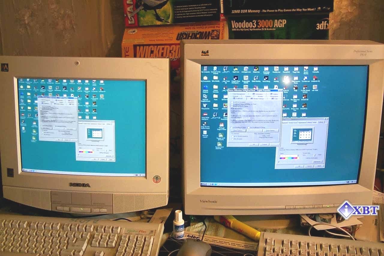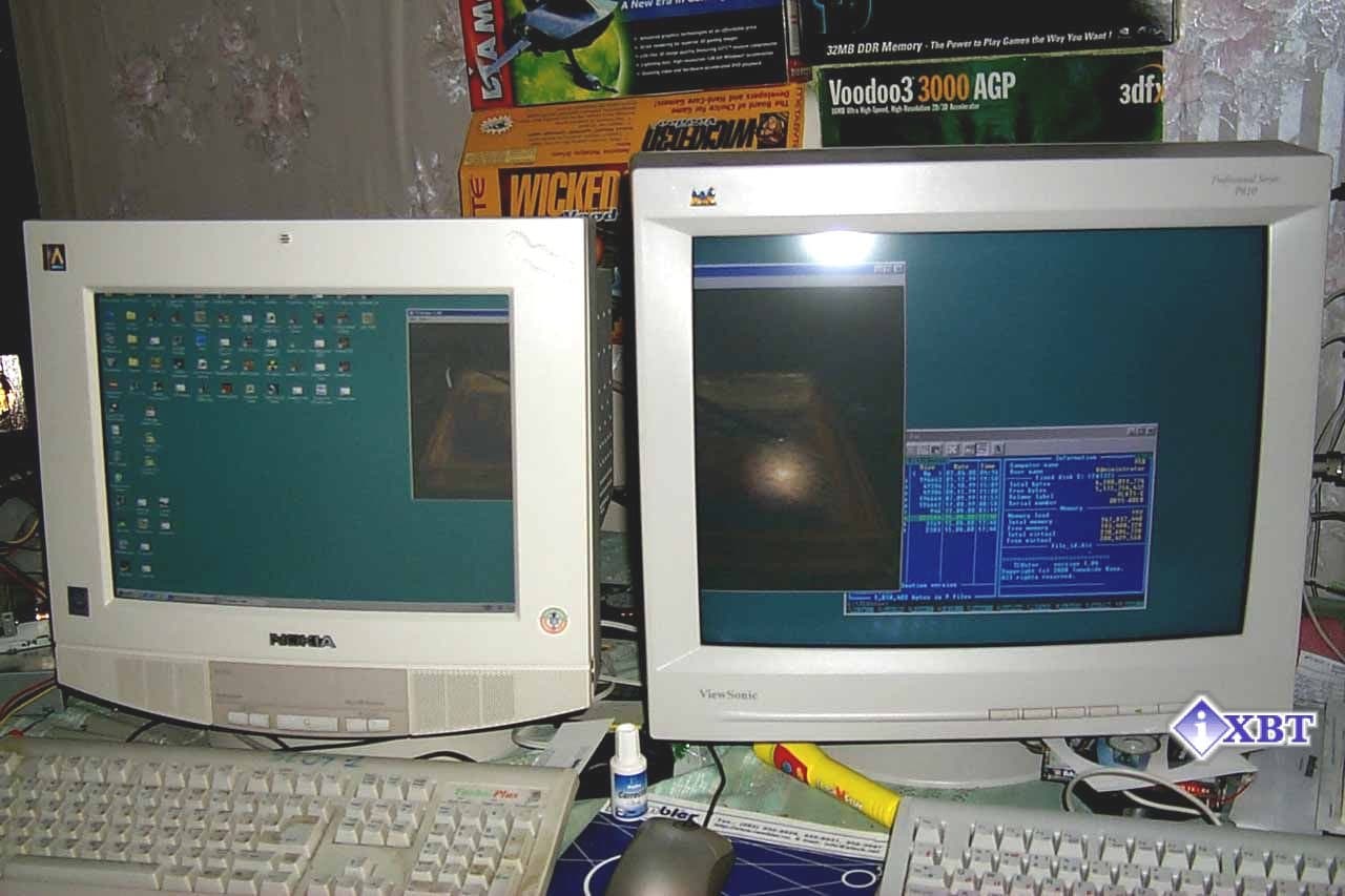 Мы знаем, что нечто подобное предлагает и NVIDIA в видеокартах на базе GeForce2 MX за счет применения технологии TwinView, однако пока в нашей лаборатории не было видеокарт с двумя выводами на мониторы, поэтому сделать полноценное сравнение нам не удалось. Как только у нас появится соответствующая карта на базе NVIDIA GeForce2 MX, то я проведу сравнение технологий TwinView и DualHead. Ныне же могу судить только по отзывам в Интернете. Главным недостатком TwinView почему-то называют ее "многочиповость", то есть, наличие на видеокарте дополнительных микросхем, обеспечивающих поддержку TwinView, что по логике обозревателей должно увеличивать стоимость видеокарт. Ну что же, ниже мы посмотрим, правы ли они, сравнив цены на карты.