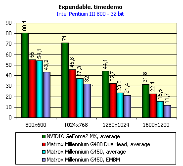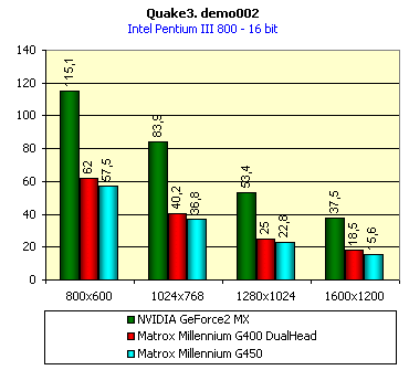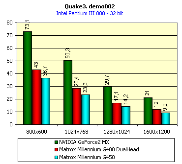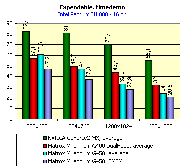 Вот тут хочется тяжело вздохнуть, сесть, закрыть глаза и сказать: "А мне это снится, снится, снится... Такого не бывает!" Да, по полной программе проиграть не только прямому конкуренту — карте на базе NVIDIA GeForce2 MX, но и своему предшественнику, работающему на такой же частоте! Это же надо умудриться такое сделать! А вот Matrox G450 совершила этот подвиг без особого труда! Так что в 3D у этой карты все печально. Только величина падения производительности при включенной поддержке EMBM осталась на том же уровне, что и у Matrox G400. Невольно возникает вопрос — а зачем Matrox вообще сделала эту карту? Потратили средства, время, а получили все тот же G400 DualHead за большие деньги и с незначительными отличиями. Тезис о том, что G450 предназначена для полупрофессиональных и профессиональных пользователей, лишь изредка использующими игры, не спасает положения. Просто обидно...