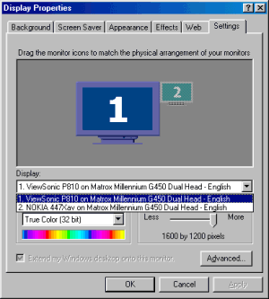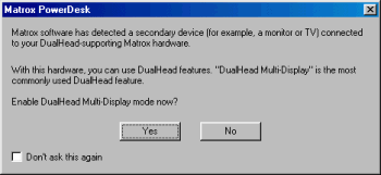 Конечно же, одним из основных достоинств чипа G450 и карт на его базе является технология DualHead. Я уже писал о ней в нашем обзоре по видеокарте Matrox G400 MAX, ныне остановлюсь лишь на основных моментах. При подключении к видеокарте двух приемников сигнала пользователь сразу узнает, что карта распознала активизацию DualHead:
