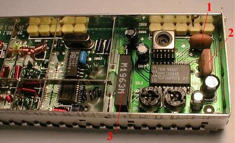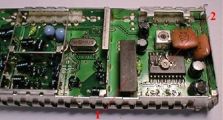 После демонтажа тюнера с RRG нужно снять с тюнера обе крышки. Осторожно, они могут быть пропаяны. На плоскостях этих крышек видны углубления. Для упрощения снятия крышек с помощью паяльника и отсоса удалите из этих углублений припой. На фотографии показан открытый тюнер перед переделкой, на нем показаны фильтры, которые необходимо заменить. К 17 и 16 выводам микросхемы необходимо будет припаять подстроечный конденсатор.