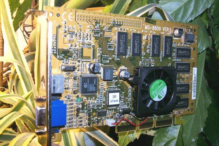 Отличительной чертой данной платы, бросающейся в глаза при первом осмотре MS-8809, является установленный на чипсете активный кулер. Хотя, по сути, он такой же, как у большинства аналогов — низкий, утопленный в радиатор, вентилятор, имеющий сильно загнутые лопасти, которые раздувают воздух по бокам. Отличием этого кулера от аналогов является то, что он в целом повыше и побольше, да и прорези для выхода горячего воздуха имеются по всему периметру радиатора, а не только по двум сторонам, как у многих других плат. Кулер крепится к видеокарте двумя пружинными зажимами. Между радиатором и чипом проложена теплопроводящая паста, призванная улучшить отвод тепла от чипа. Кстати, такой же кулер использовался на предыдущей рассмотренной нами карте Chaintech Desperado RI70, поэтому издали эти карты можно даже спутать, насколько они похожи.