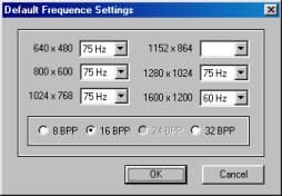 Resolution Colors Vertical Refresh Rate 640x480 8/16/32 bits 60Hz to 240Hz 800x600 8/16/32 bits 60Hz to 240Hz 1024x768 8/16 bits 60Hz to 240Hz 1024x768 32 bits 60Hz to 200Hz 1152x864 8/16 bits 60Hz to 200Hz 1152x864 32 bits 60Hz to 170Hz 1280x960 8/16 bits 60Hz to 170Hz 1280x960 32 bits 60Hz to 150Hz 1280x1024 8/16 bits 60Hz to 170Hz 1280x1024 32 bits 60Hz to 150Hz 1600x900 8/16 bits 60Hz to 150Hz 1600x900 32 bits 60Hz to 120Hz 1600x1200 8/16 bits 60Hz to 120Hz 1600x1200 32 bits 60Hz to 100Hz 1920x1080 8/16 bits 60Hz to 100Hz 1920x1080 32 bits 60Hz to 85Hz 1920x1200 8/16 bits 60Hz to 100Hz 1920x1200 32 bits 60Hz to 85Hz 1920x1440 8/16 bits 60Hz to 85Hz 1920x1440 32 bits 60Hz to 75Hz 2048x1536 8/16 bits 60Hz to 75Hz 2048x1536 32 bits 60Hz