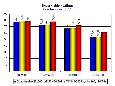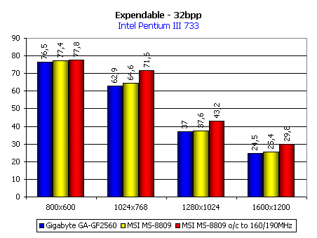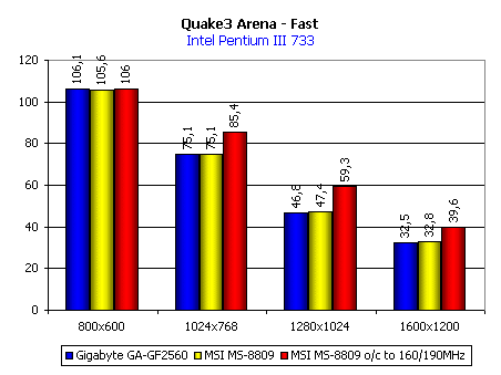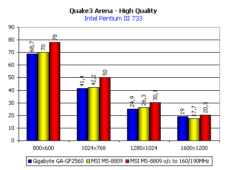 Этих инструментов вполне достаточно для того, чтобы показать производительность видеокарты. Для наглядности на диаграммах приведены скоростные показатели аналогичной видеокарты на GeForce256 с памятью типа SDR SDRAM: Gigabyte GA-2560. Также, на этих же диаграммах мы покажем работу видеокарты MSI MS-8809 при разгоне.
