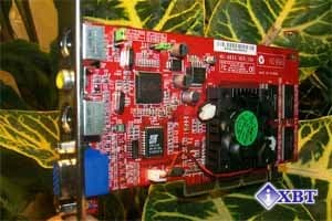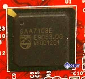 На плате установлена дочерняя карта с TV-out (чип Conexant BT819), гнездо S-Video. В поставку входит переходник S-Video-to-RCA, поэтому все смогут без проблем воспользоваться этой функцией карты.