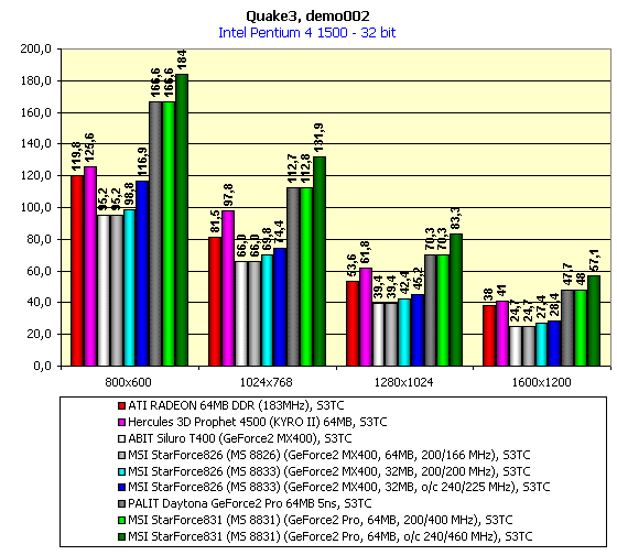 - MSI MX400 Pro64S (MS 8826) показала производительность на уровне рядовых GeForce2 MX, поскольку частота работы памяти в 166 МГц не позволила этой карте в 32-битном цвете продемонстрировать производительность GeForce2 MX400 (даром, что установлено 64 мегабайта памяти).