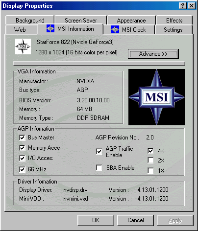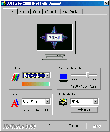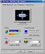 С картой поставляется комплект драйверов от NVIDIA версии 12.40. Но это еще не все. Читателям, которые помнят наши обзоры видеокарт от MSI, знакома фирменная утилита от этой компании — 3D!Turbo 2000. Эта программа поставляется с драйверами и обеспечивает возможности как по разгону видеокарты, так и по настройке 2D-графики: