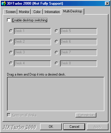 Кроме общепринятых настроек 3D!Turbo 2000 позволяет организовать виртуальные рабочие столы на экране.