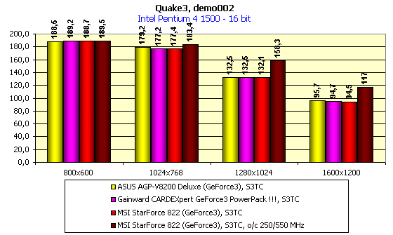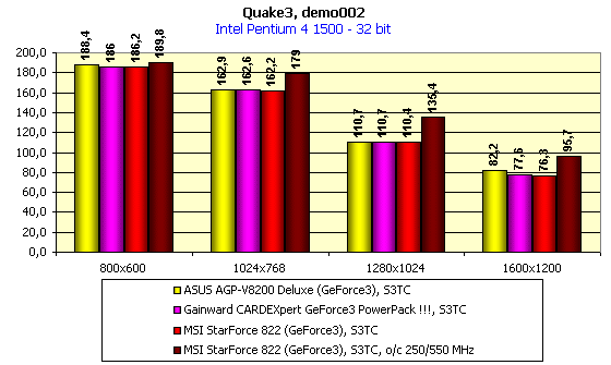 Приступаем к оценке производительности видеокарты в 3D. В качестве инструментария мы использовали id Software Quake3 v.1.17 — игровой тест, демонстрирующий работу платы в OpenGL с использованием стандартного демо-бенчмарка demo002.