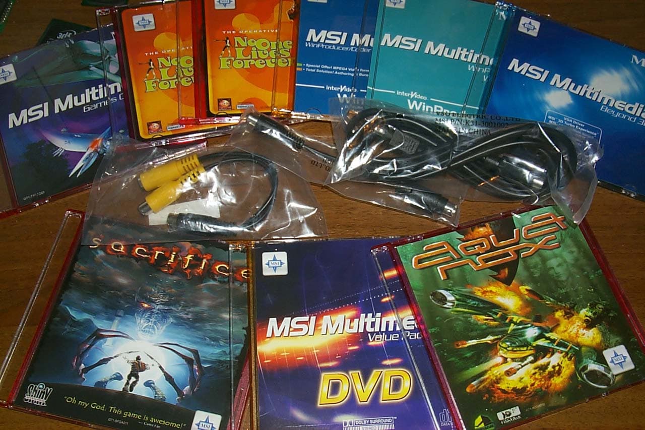 Надо отметить, что к сожалению, кроме упомянутого выше переходника для VideoIn в комплект забыли положить переходник DVI-to-D-Sub. А в остальном поставка просто великолепна! Все диски — не в картонных/бумажных пакетиках, а в полупрозрачных слим-коробочках разного цвета. Конечно, это придает вес комплекту :-), однако диски в такой упаковке сохраняться намного дольше.