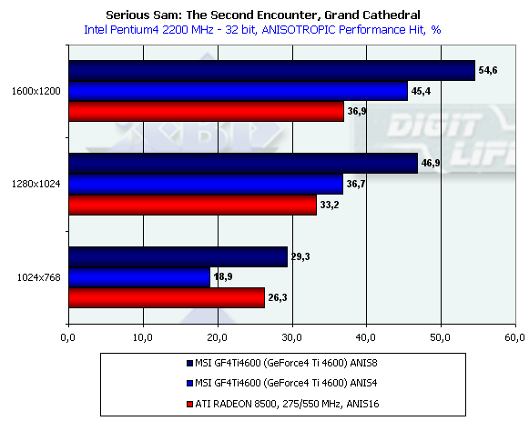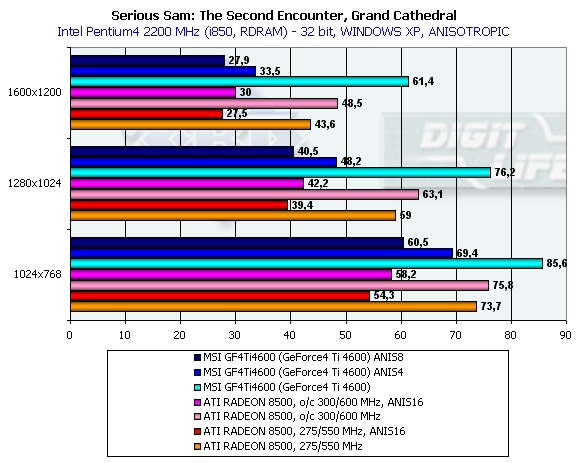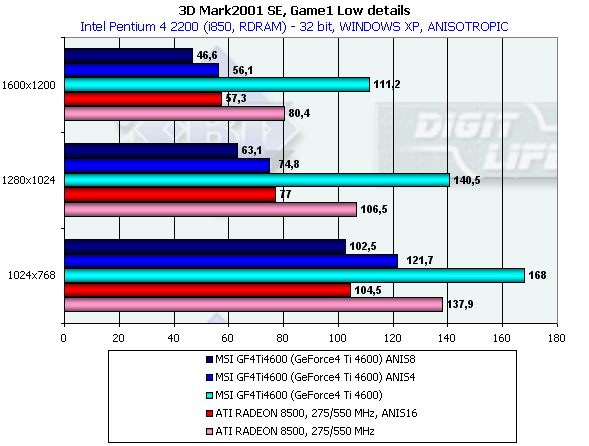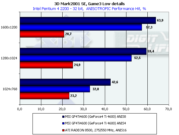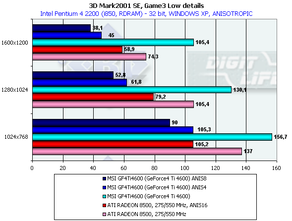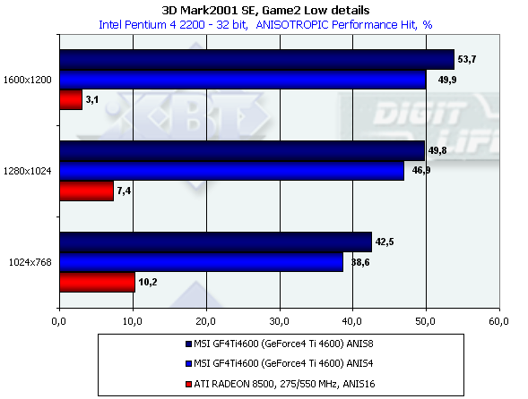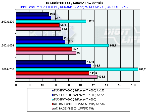 В этом тесте довольно много "покатых" поверхностей, которые RADEON 8500 "пропускает", поэтому производительность у GeForce4 Ti 4600 на максимальной степени анизотропии даже ниже, чем у RADEON 8500.
