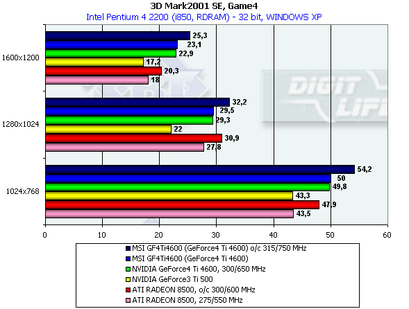 Вот и добрались до того момента, когда поникшие поклонники ATI смогут улыбнуться и поправить свое настроение. Как мы видим, программисты из ATI славно потрудились над повышением производительности в этом тесте, и RADEON 8500 уверенно обгоняет Ti 500, и даже приближается к GeForce4 Ti 4600.