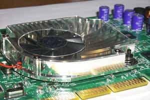 Внимание привлекает несколько необычная конструкция охлаждающего устройства. В целом, форма радиатора идентична той, что мы видели на карте от NVIDIA, но металлическая крышка заменена на прозрачную пластиковую. Безусловно, это придает некий шарм общему внешнему виду, но вот шум, который взамен получает пользователь от такого кулера, думаю, не понравится (впрочем, я писал об этом еще при рассмотрении видеокарт на базе GeForce4 MX, поскольку на MX460 от MSI установлен точно такой же кулер).
