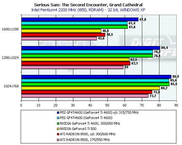- Serious Sam: The Second Encounter v.1.05 (Croteam/GodGames) — OpenGL, мультитекстурирование, Grand Cathedral demo, настройки тестирования: quality, S3TC OFF, Trilinear