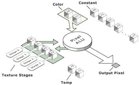 Тут и вправду все просто, но, отметим, со вкусом. Еще бы, шейдер вычисляется для каждой закрашиваемой точки треугольника, он должен выполняться максимально быстро и без затей. Есть 8 констант, два цвета (интерполированные по поверхности примитива), текстурные стадии, с которыми мы можем взаимодействовать. Есть два временных регистра. Наша задача посчитать результирующий цвет точки. Доступно изрядное количество команд, похожих на описанные ранее команды для вычислений на текстурной стадии, но более гибких. Команды достаточно продуктивны и выполняют сразу несколько дел. Это неудивительно — их максимальное число равно числу текстурных стадий (для NV20 это всего лишь 8). Пиксельный шейдер не интерпретируется в классическом понимании — это скорее настройка ступеней конвейера. Соответственно, и выполняется он эффективно, выдавая по одному результату за такт. И вновь ничто не мешает параллельному существованию в железе нескольких конвейеров, настроенных одинаковым образом.