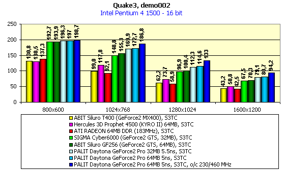 В качестве инструментария мы использовали id Software Quake3 v.1.17 — игровой тест, демонстрирующий работу платы в OpenGL с использованием стандартного демо-бенчмарка demo002.