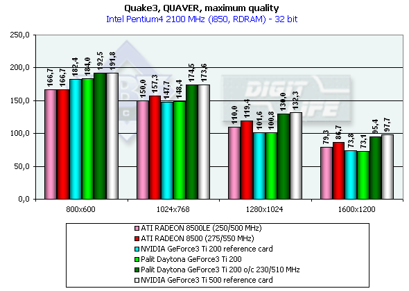 Этот тест нам показал, что Palit Daytona GeForce3 Ti 200 находится примерно на одном уровне с ATI RADEON 8500LE и полностью по производительности совпадает с результатами NVIDIA GeForce3 Ti 200 reference card. Как и следовало ожидать, такой подъем частот при разгоне принес ощутимые дивиденды карте, почти сравняв ее с NVIDIA GeForce3 Ti 500.