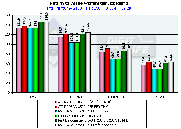 - Return to Castle Wolfenstein (id Software) — игровой тест, демонстрирующий работу платы в OpenGL с использованием нами созданного и записанного демо-бенчмарка ixbtdemo.