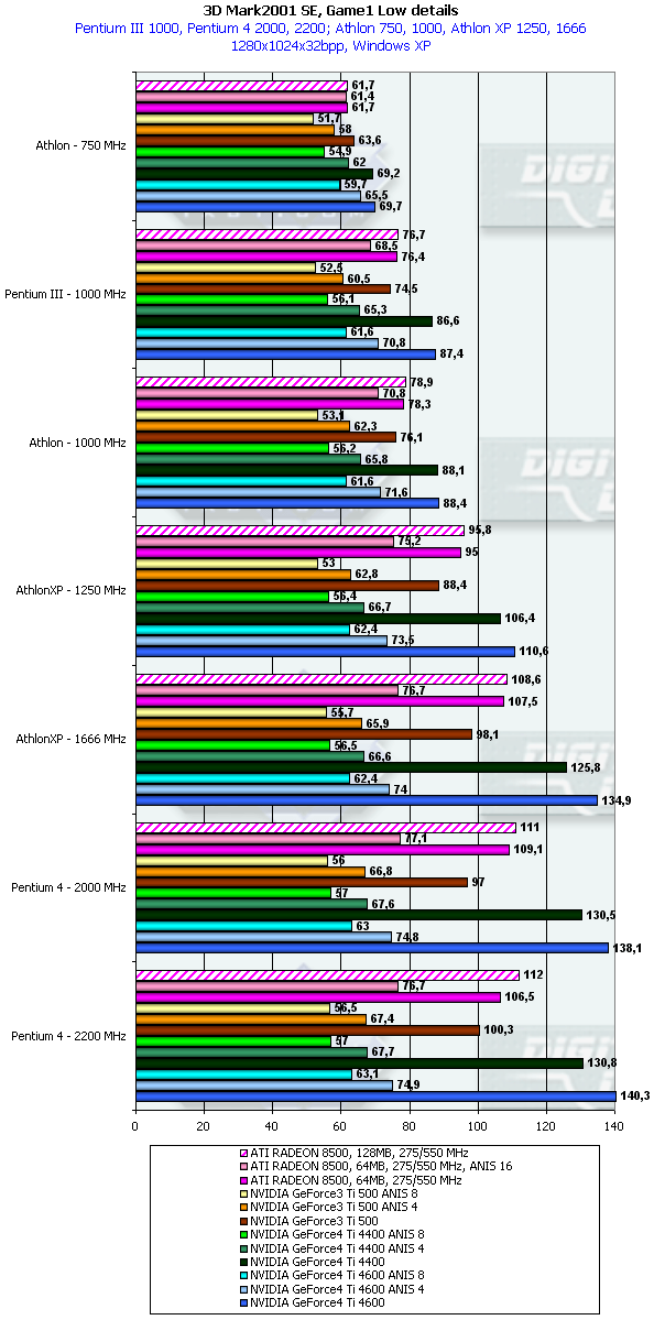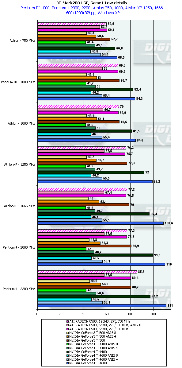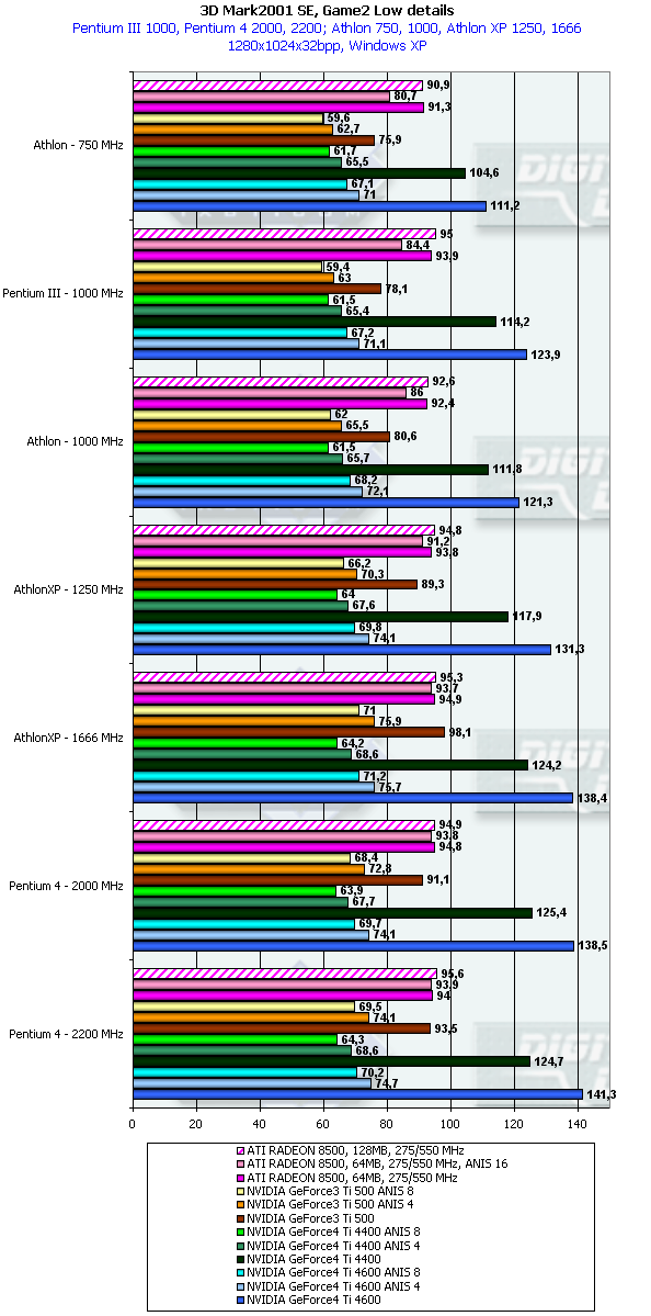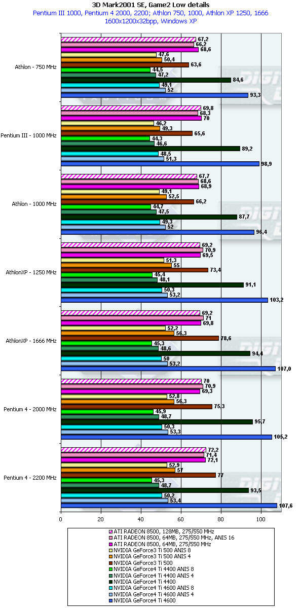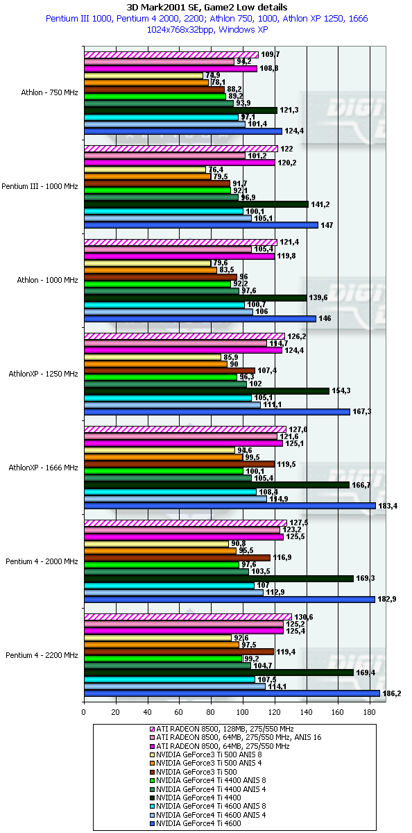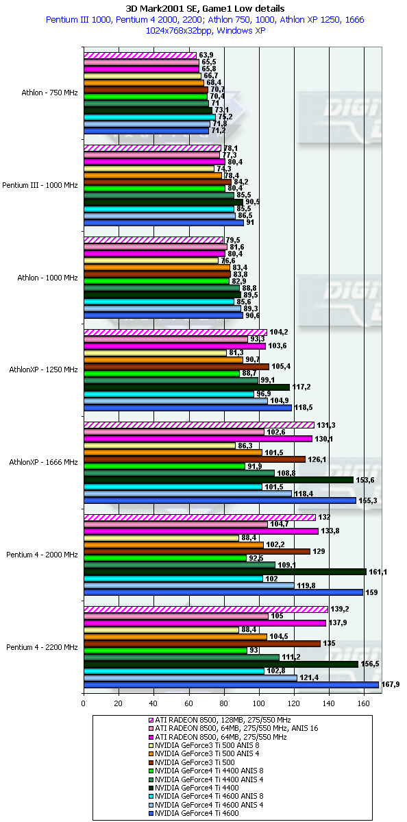 В данном случае картина немного более отрадная для GeForce4 Ti. но только относительно GeForce3 Ti 500. Относительно RADEON 8500 даже говорить не стоит. Стыд и позор для такого детища, носящего славное имя High-End продукта!