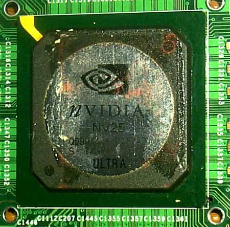 А вот и сам GPU (ревизия А2). Замечаем, на нем нанесено кодовое наименование NV25, а также дата выпуска этого чипа — конец 2001 года. Напомню, что ныне уже стали появляться в продаже карты, имеющие чипы ревизии А3 и официальную маркировку.