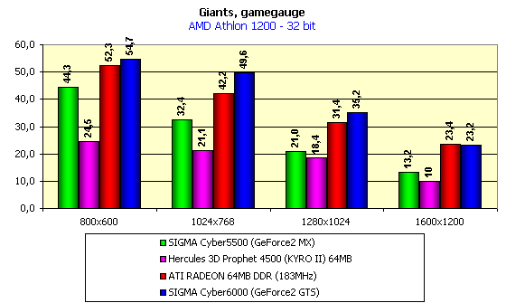 До сего момента картина относительно судьбы и будущего KYRO II выглядела весьма радужно, однако мы запустили тяжелое приложение, имеющее очень сложные сцены, а также использующее Hardware TCL. И что мы видим? Сокрушительное поражение KYRO II. Даже карта на GeForce2 MX легко обошла Hercules 3D Prophet 4500. А ведь Giants — это не технодемка, не синтетический тест, а реальная игра, которая вовсю продается. Конечно, тестирование проводилось при максимальном качестве и при включенных эффектах рельефного текстурирования (Dot3 и EMBM), а также кубического текстурирования. Поэтому этот тест для всех карт был весьма сложным, однако столь сильное падение KYRO II не может не вызывать разочарования.