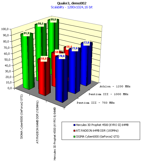 - — 1280x1024 — это разрешение венчает возможности всех карт по масштабируемости. Уже все три представленные карты не имеют прироста производительности при увеличении частот работы CPU. В 16-битном цвете KYRO II по-прежнему опережает ATI RADEON DDR.