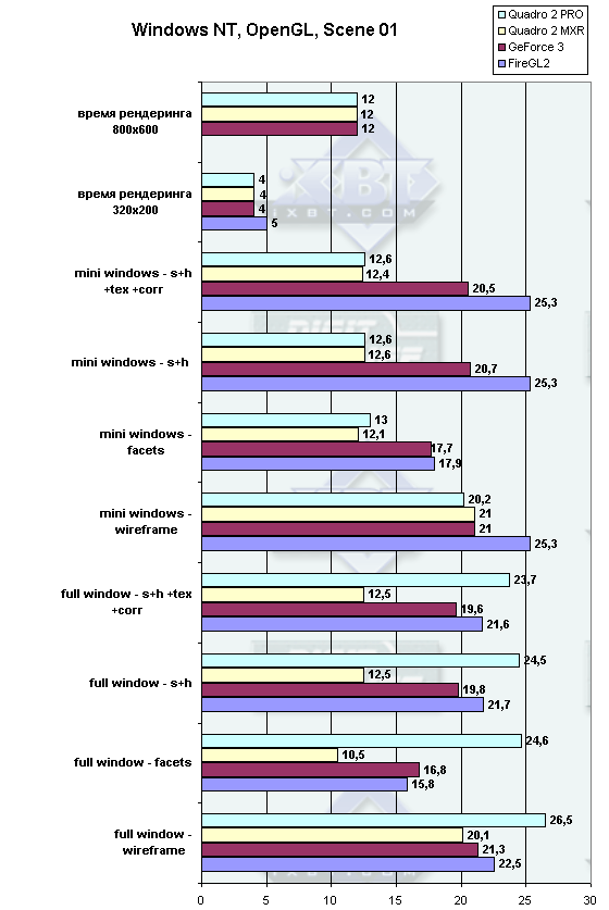 Скорость загрузки этой сцены, хотя она заметно сложнее предыдущей, также невысока и составляет менее 2 секунд для FireGL2, GeForce3 и Quadro2 PRO и 2 секунды на Quadro2 MXR.