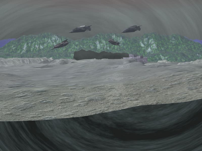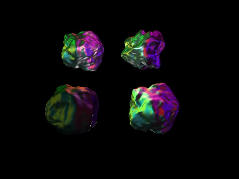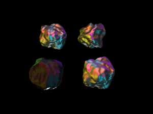 - Сцена 4 не содержит сложной геометрии, она предназначена для тестирования работоспособности ускорителя с большим количеством источников света. Состоит из 4 геометрических объектов неправильной формы, общее число треугольников составляет 24960 при 12488 вершин. Используется 10 источников света типа Omni. Отрендеренный скриншот сцены: