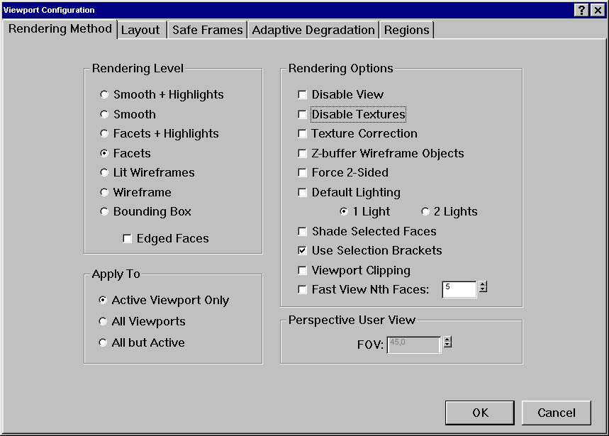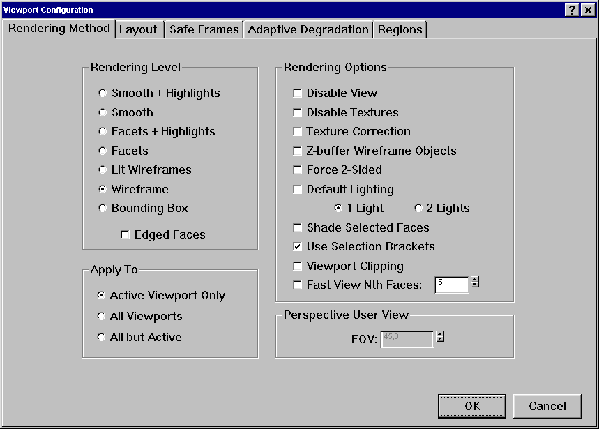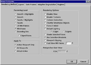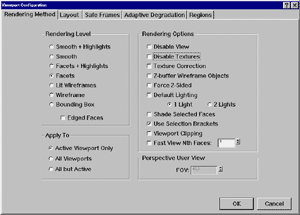 Настройки каждой сцены можно изменить через контекстное меню, щелкнув правой клавишей мыши на рабочем поле окна. Почти все параметры вьюпорта задаются в меню Viewport Configuration.