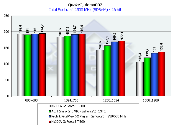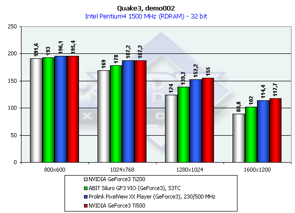 Это краткое тестирование нам демонстрирует, что Prolink PixelView XX Player обладает потенциалом, почти досягающим GeForce3 Ti500, что и ожидалось, учитывая повышенные частоты работы карты.