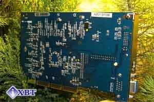По своему конструктиву плата полностью соответствует эталонному дизайну. Яркой особенностью Hercules 3D Prophet II Pro является цвет PCB. Такой лазурно-синий цвет мы уже могли наблюдать у видеокарт от Gigabyte, визитной карточкой карт от Hercules стало сочетание такого цвета PCB с более нежной голубой окраской радиаторов на модулях памяти.