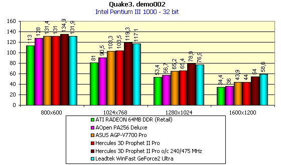 Для сравнительного анализа были использованы показания с видеокарт ATI RADEON 64MB (Retail-поставка, частоты 183/183 МГц), AOpen PA256 Deluxe, Leadtek WinFast GeForce2 Pro и ASUS AGP-V7700 Pro.