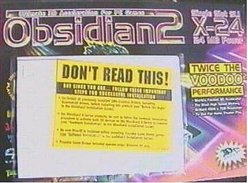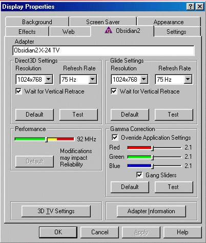 Поскольку плата Obsidian2 X-24 отличается от обычных акселераторов на Voodoo2, то стандартные reference-драйвера от 3Dfx с ней не работают. Но, Quantum3D позаботилась и о пользователях, которые стремятся использовать самые последние версии Glide. Метод установить reference-драйвера все же есть. Правда, при этом не будут доступны настройки TV-оut, ну и вообще вся специфичная закладка в свойствах видеоадаптера. Для этого, после удаления всех следов Obsidian2 в Device Manager и Control Panel и установки reference-драйвера, необходимо воспользоваться патчем для регистри, доступном на сайте Quantum3D.