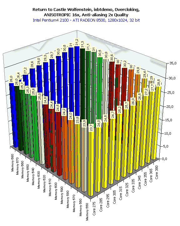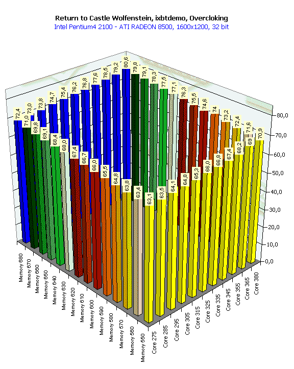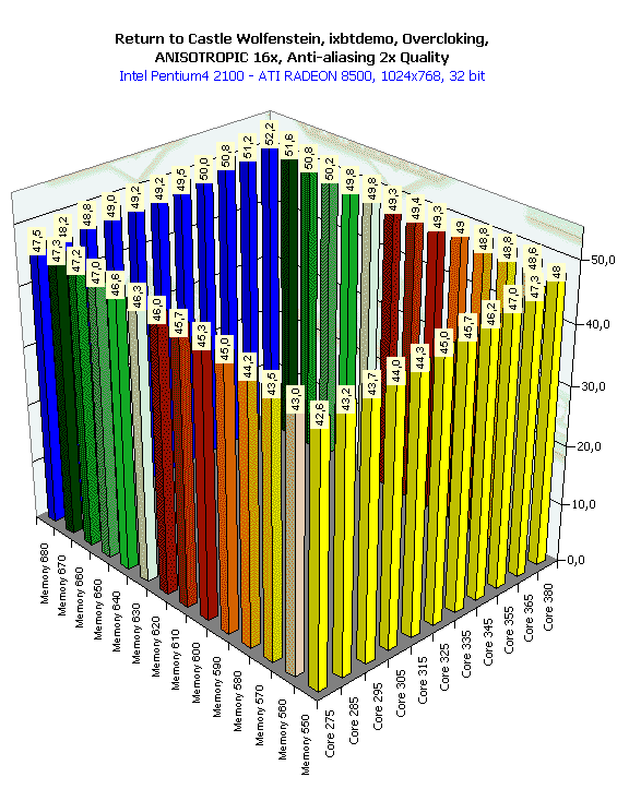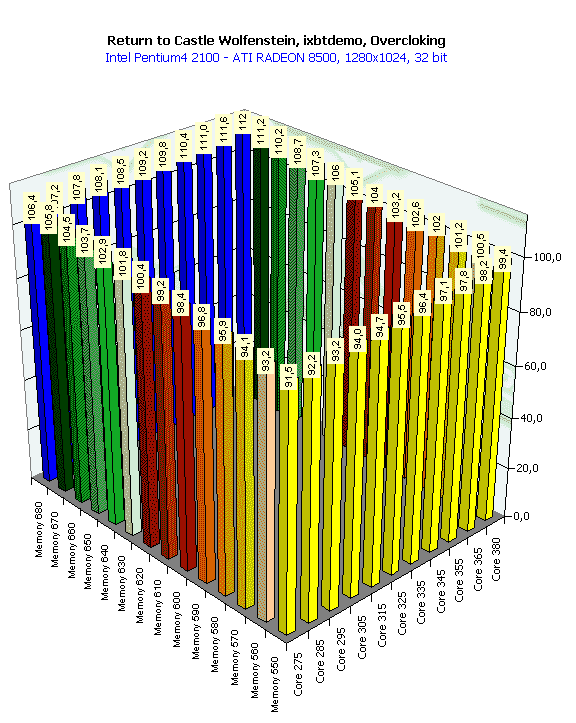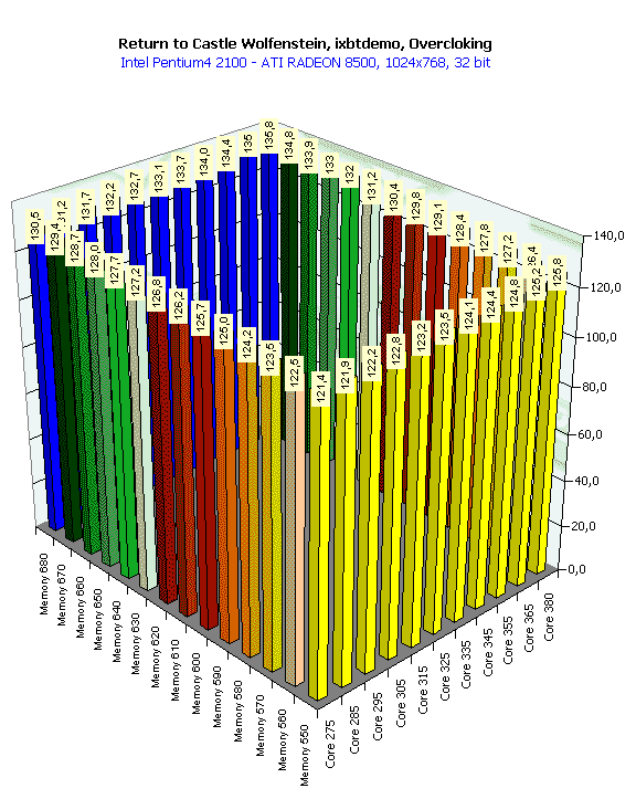 Впрочем, есть предположение, что такая "вялая" реакция RADEON 8500 на разгон обусловлена влиянием конкретной платформы (i850, Pentium4), то есть возможно, что где-то драйверы не оптимизированы под данную платформу, и видеокарта просто подчас простаивает.