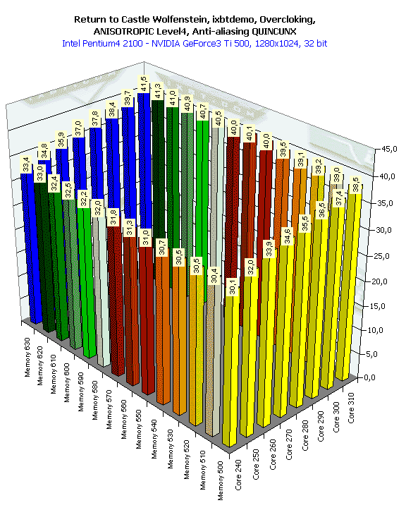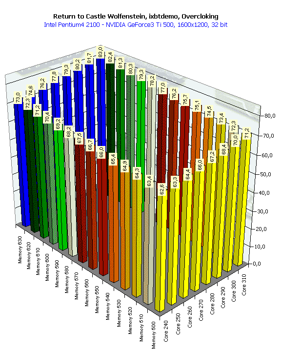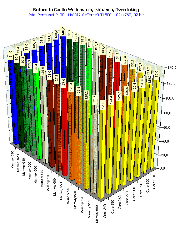 В целом, картина почти схожа, однако надо иметь в виду, что максимально достигнутые частоты у этой карты сильно ниже, чем у RADEON 8500 (поскольку Ti 500 — это уже своего рода разогнанная реинкарнация GeForce3). Давайте составим таблицу для удобства анализа.