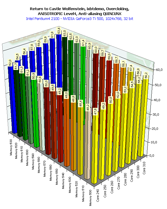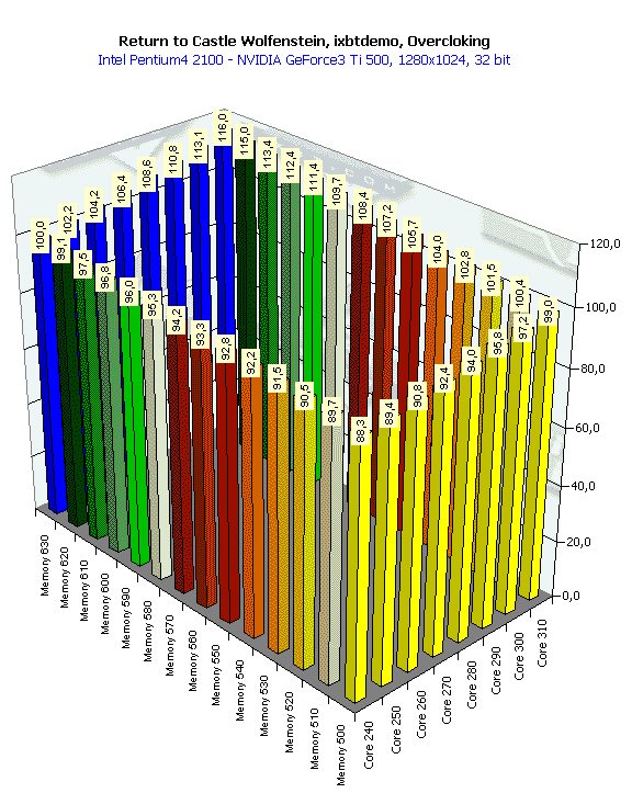 Сразу в глаза бросается то, что приросты от таких, казалось бы, запредельных частот не очень велики. Разумеется, сказывается сложность данного теста (это не Quake3, где производительность зашкаливает за 170-200 fps), однако лично мне хотелось бы бОльших приростов. Посмотрим, как себя показала карта на NVIDIA GeForce3 Ti 500.