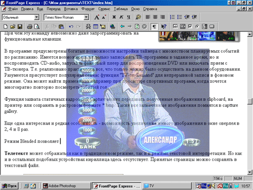 Качество приема ТВ сигналов можно оценить как высокое, особенно в сравнении с некоторыми ранее протестированными платами (NVIDIA Personal Cinema, Matrox G450 eTV, ATI All-in-Wonder RADEON, ASUS V7100 Deluxe Combo и др.). Разумеется, это заслуга нового модуля тюнера, устанавливаемого на эти платы. Ниже приведены скриншоты некоторых принимаемых каналов, полученные при помощи функции захвата статичных кадров Still Capture в программе тюнера.