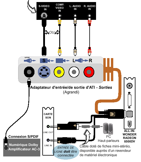 Аккуратно сделанный пластмассовый бокс соединяется с платой толстым шнуром, оканчивающимся внушительным многоконтактным разъемом с защелкой. Из этого разъема выходят еще два тоненьких шнурка. Один из них идет на линейный вход звуковой карты, а второй через разъем mini-jack "врезается" в сигнал с линейного выхода звуковой карты. Понять необходимость в таком соединении я не смог, тем более что на самой видеокарте также имеется еще один разъем для подключения к любому свободному внутреннему входу звуковой карты, например aux или cd-in. И такое подключение мне видится более разумным и простым.